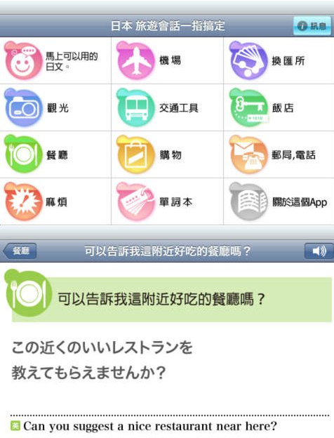 到日本旅游的旅客不一定都懂得日文,因此万一遇上需要沟通的时候便会不知所措。这个 App 内置了多种常用场景,包括餐厅、购物、乘坐交通工具等,只要进入相应场景画面便会显示适用的日语。另外用家更可以按下 App 的发声键,由手机代替用家说话。(繁体字版)