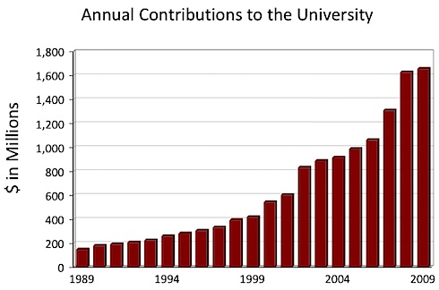 89年到09年这20年间,哈佛基金会收到的各种捐款数额年年递增