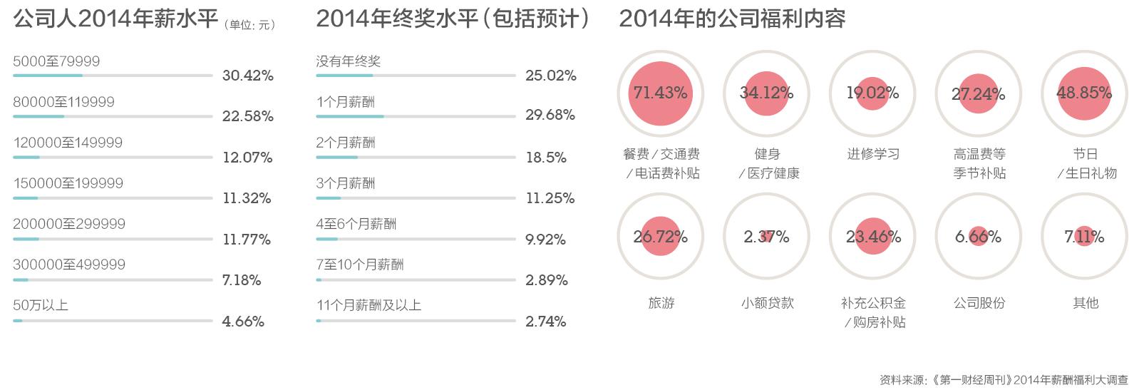 员工的薪资涨幅分为3档,第1档涨幅30%以上、第2档涨幅15%至20%、第3档不变。年终奖发3个月工资,高级别员工还有业绩提成和额外奖金。2014年员工平均年终奖为1.5万元。