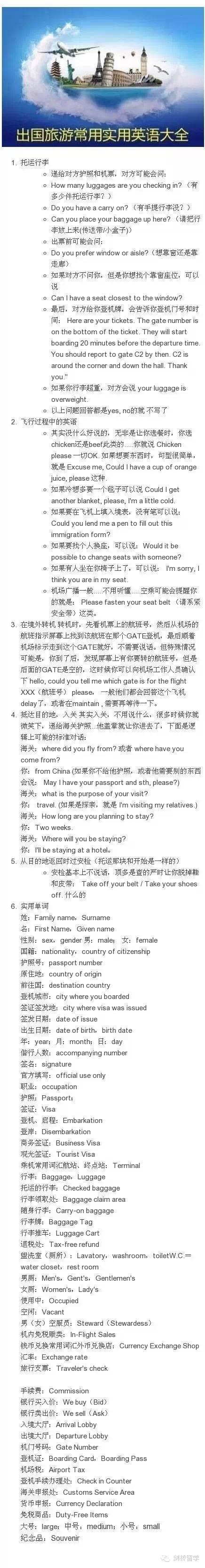 【出国旅游常用实用英语大全】假设你选择的是国外航空公司,同时该公司没有中文服务人员.这时候该怎么办呢?快点储备一些出国旅游实用句型吧~