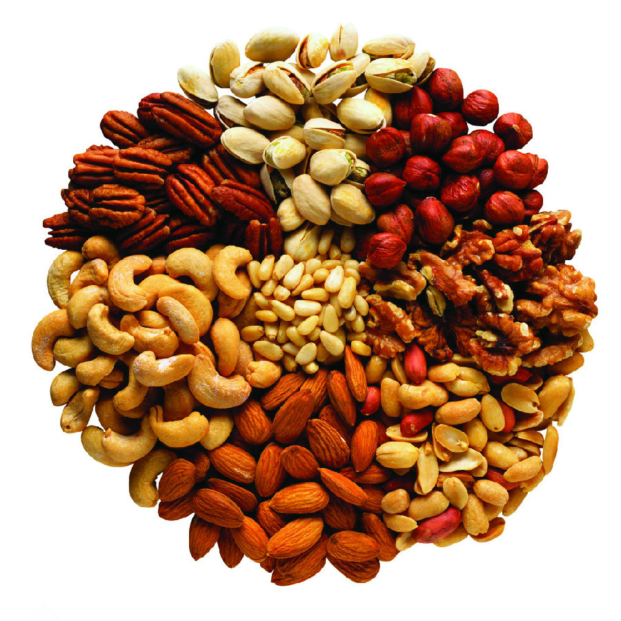 腰果Cashew nuts 花生peanut 无花果fig 榛子filbert hazel 栗子chestnut 核桃walnut 杏仁almond 果脯preserved fruit 芋头taro 葡萄干raisin cordial 开心果pistachion 巴西果brazil nut 菱角,荸荠water chestnut (和国内食用法不同,做坚果食用)
