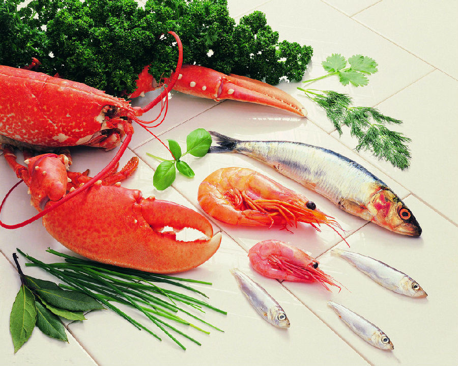 虾仁Peeled Prawns;龙虾lobster;小龙虾crayfish;蟹crab;蟹足crab claws;小虾shrimp;对虾、大虾prawn;(烤)鱿鱼(toast)squid;海参sea cucumber;扇贝scallop;鲍鱼sea-ear abalone;小贝肉cockles;牡蛎oyster;鱼鳞scale;海蜇jellyfish;鳖、海龟turtle;蚬、蛤clam;鲅鱼culter;鲳鱼butterfish;虾籽shrimp egg;鲢鱼、银鲤鱼chub silver carp;黄花鱼yellow croaker